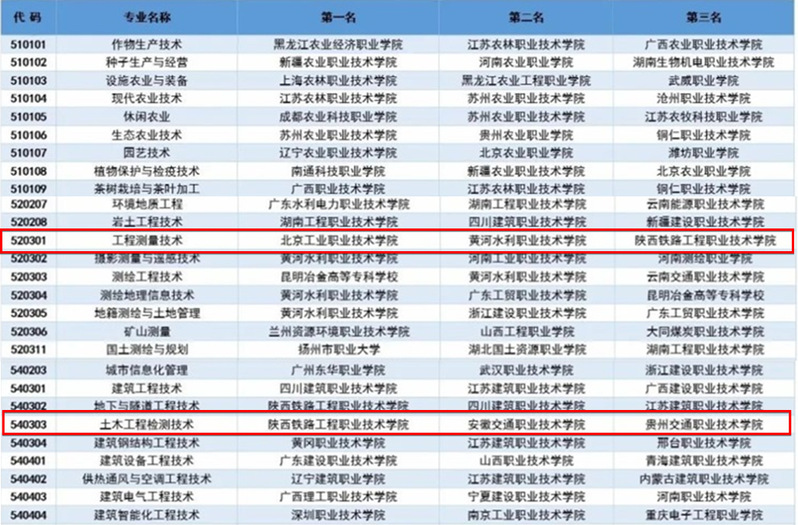 公司开设有工程测量技术(国家“双高”建设专业、国家骨干专业、央财支持建设专业、陕西省一流专业)、土木工程检测技术(国家“双高”建设专业、国家骨干院校建设专业、国家教学资源库立项建设专业、陕西省一流专业)、摄影测量与遥感技术、材料工程技术4个专业。据金平果2020年高职专分业竞争力排行显示,土木工程检测技术排名全国第一,工程测量技术专业位居全国前三。