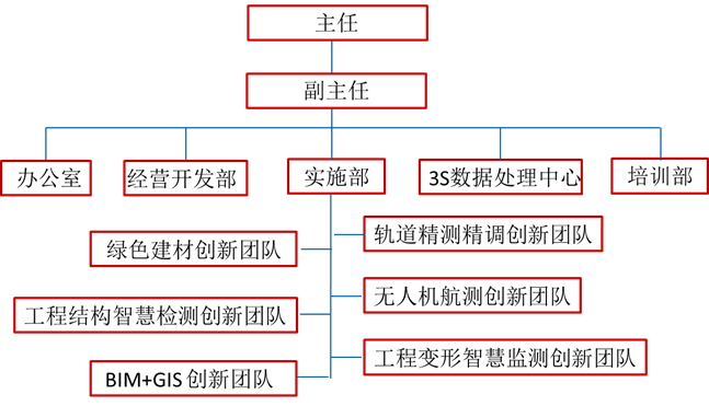 研究中心设有主任1名,副主任1名。下设办公室、经营开发部、3S数据处理中心、实施部、培训部5个部门。中心共有专业技术人员48名,其中高级职称19人,注册测绘师7人,测绘地理信息行业高级技师8人,公路水运试验检测工程师9人。拥有轨道精测精调、无人机航测、工程变形智慧监测、BIM+GIS、绿色建材、工程结构智慧检测等6个技术创新服务团队,团队成员均为硕士以上学历,中心还聘有企业兼职顾问6人,形成了一支师德高尚、业务精湛、结构合理、充满活力的团队。