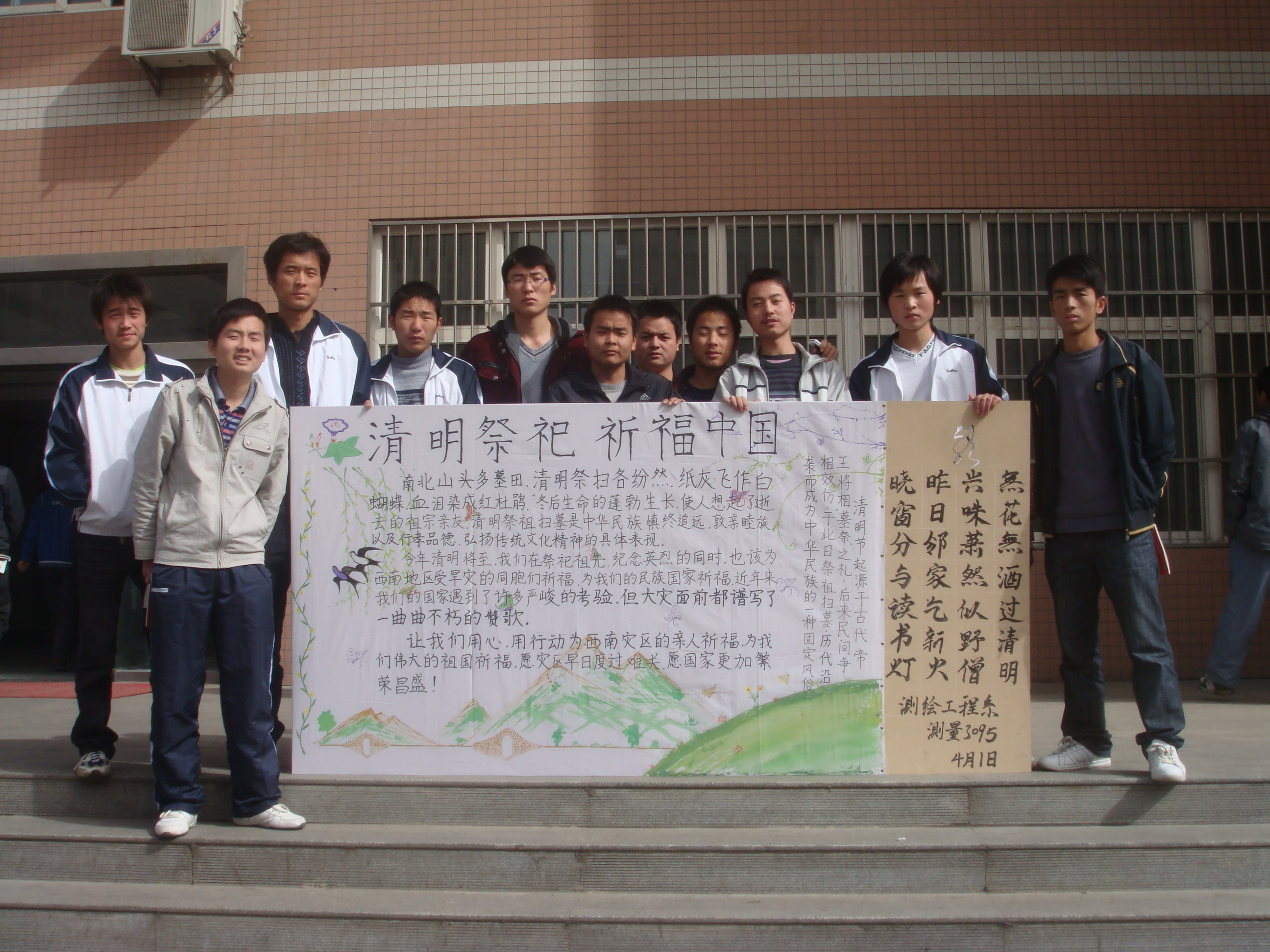 清明节是我国物候变化,时令顺序的标志;又是传统节日也是最重要的祭祀节日。为纪念这一节日,增强同学们的爱国意识,进一步弘扬传统文化,建设中华民族共有的精神家园,测量3095全体同学于2010年4班月1日特举办主题班会及“清明祭祀,祈福中国”的展出活动。 制作板报同学合影