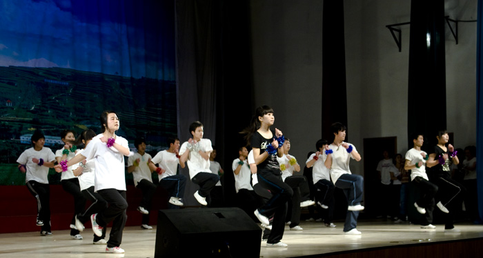 4月22日晚,公司文体中心灯火璀璨、耀眼夺人。k8凯发第六届田径运动会暨体育节之健美操比赛激情上演,来自各系的七支健美操队参加了比赛。经过激烈角逐,我系代表队荣获第二名的好成绩。 王经理(左4)参加观看比赛我系精彩节目比赛现场
