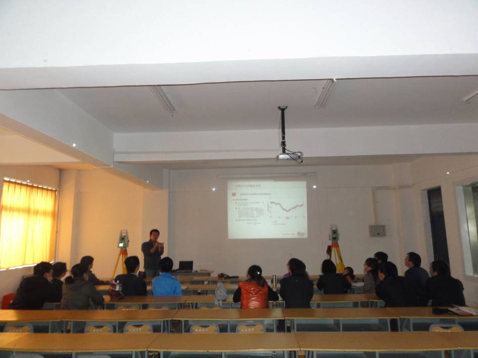 测绘系邀请了徕卡测量系统贸易有限公司技术员张航作了一上午的专题培训,培训主要从TS30型全站仪的基本特点、基本操作、数据传输及数据处理等几个方面展开,技术员为全体教师讲解了该仪器的先进性能和各种功能的具体操作。