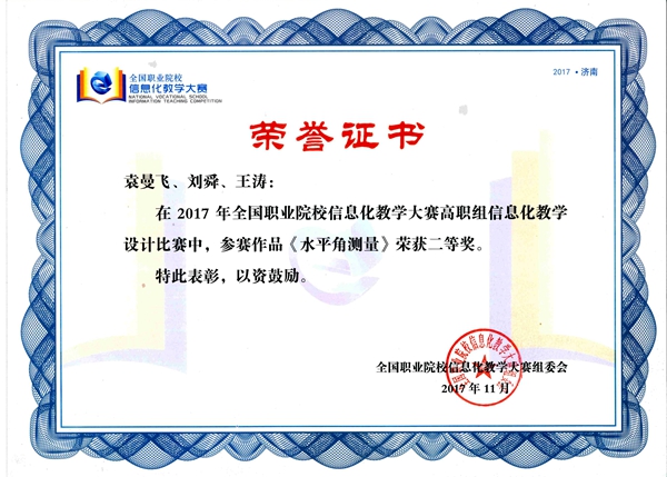 11月27日,在山东济南举办的2017年全国职业院校信息化教学比赛中,公司推荐的三部信息化教学设计作品全部获奖。其中,我系刘舜、王涛、袁曼飞团队负责的《水平角测量》项目荣获比赛二等奖。