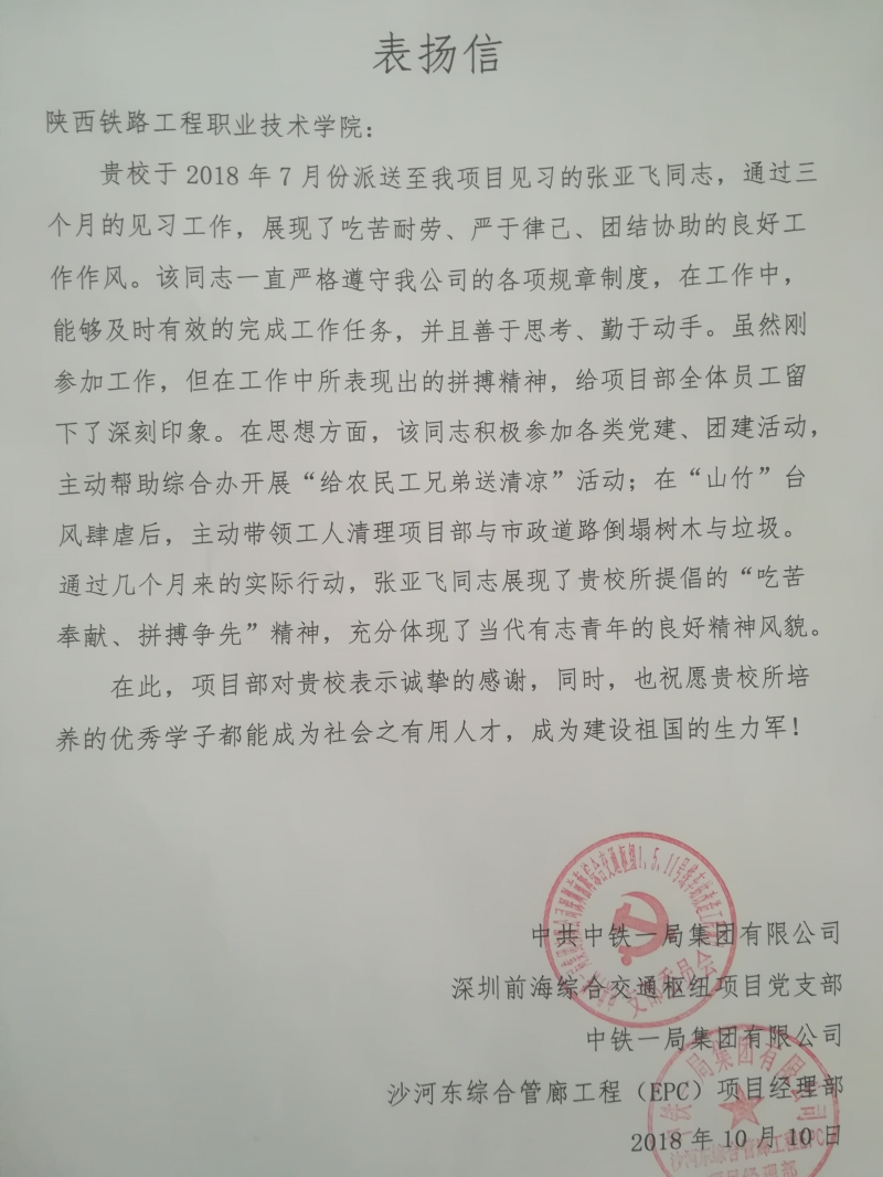 张亚飞,男,19988月生,团员,现为陕铁院测绘系2016级测量3162班班员工,20187月签约中铁一局深圳分公司,并于同月到深圳沙河综合管廊工程项目部进行顶岗实习,从事测量相关工作。