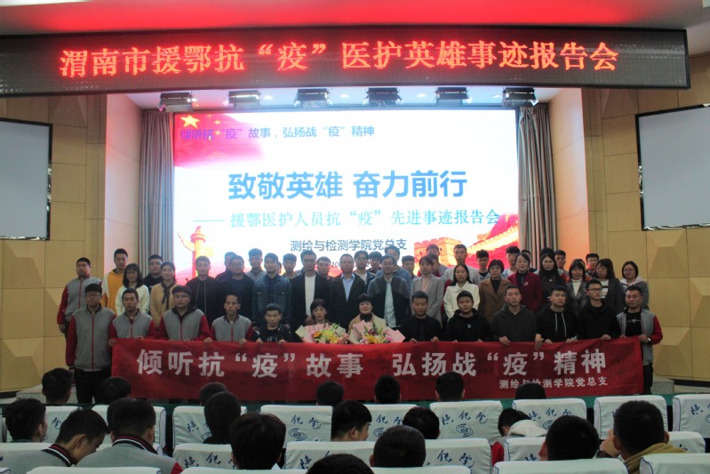 最后,杨书记做总结发言,他表示,两位援鄂护士是广大师生的学习榜样,是人民的勇士,国家的英雄,渭南的骄傲,号召所有师生学习他们吃苦奉献、国难当头挺身而出的精神,以昂扬的斗志和精神状态做好自己的工作,将伟大的抗疫精神发扬光大!座谈会后,两位援鄂护士代表与参会师生合影留念。