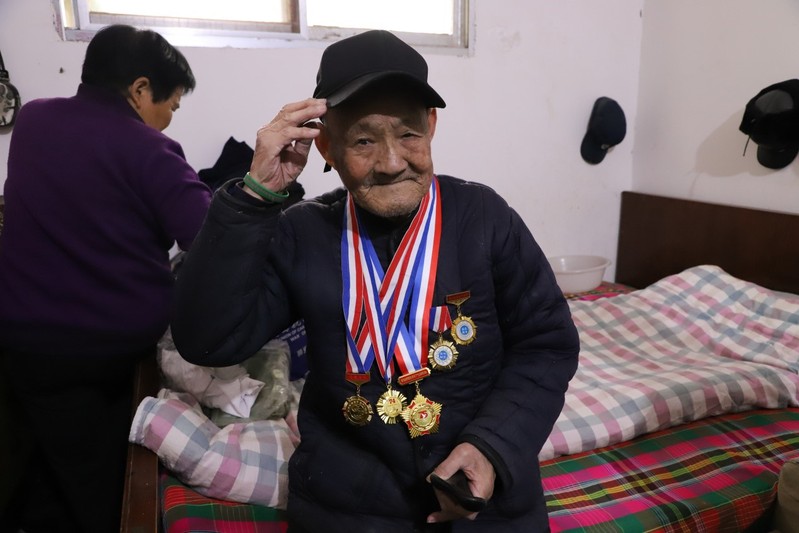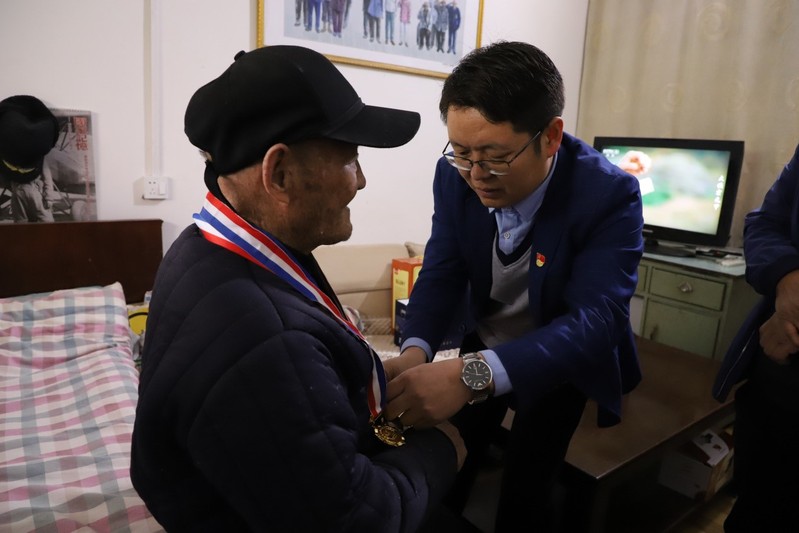 帮助老人佩戴军功章