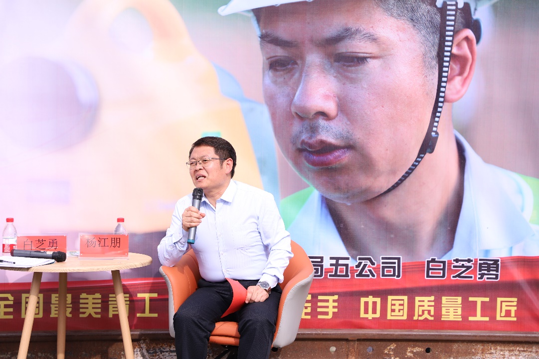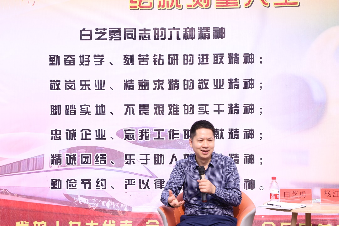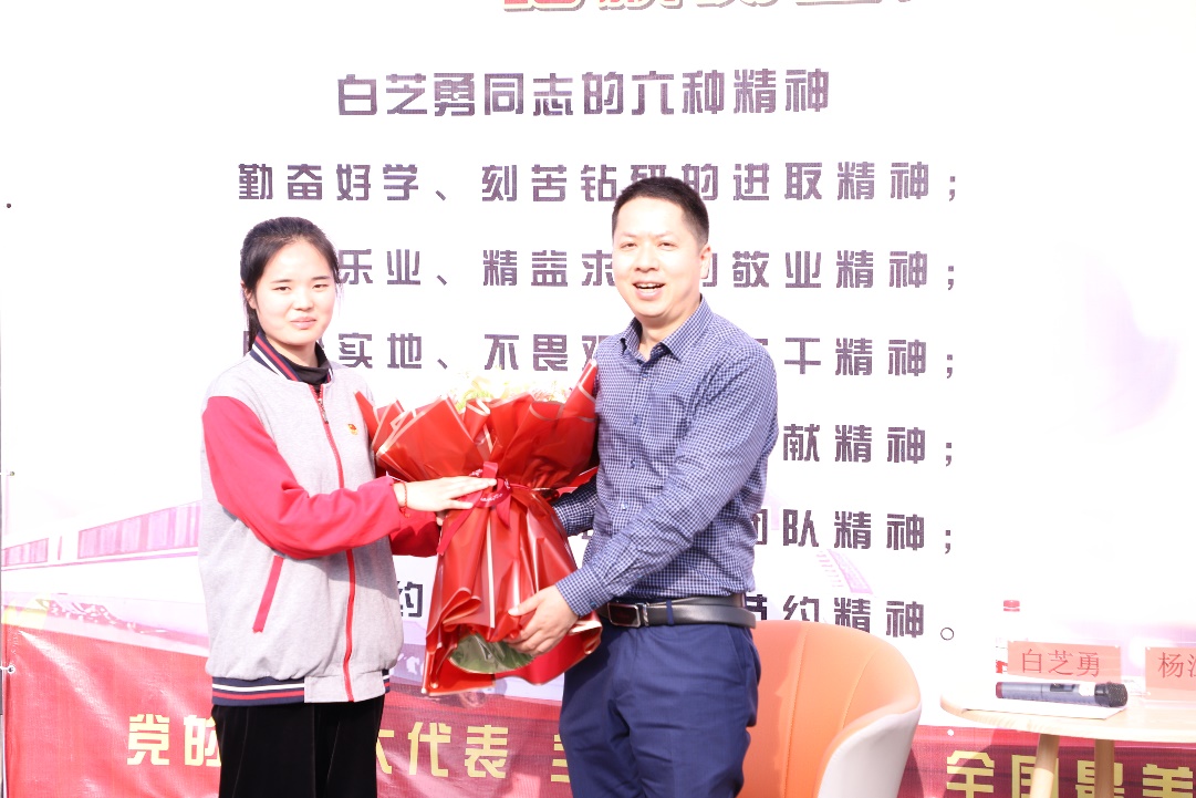 交流会现场,全国劳模、党的十九大代表白芝勇首先结合自身的成长历程,工作经历,回顾自己从一个普通测量工到中铁一局五公司高级测量师的经历,用质朴生动的语言讲述了工匠精神的具体内涵,结合山区测量作业具体的工程事例,从四个方面对工匠精神进行了诠释,他认为工匠精神是一种坚持不懈的态度,是不断学习的动力,是不怕吃苦的干劲和勇于创新的活力,鼓舞新时代青年要勤于实践,强化动手能力,丰富专业经验,要始终坚信机会是留给有准备的人的。然后,白芝勇老师与员工代表热情互动,员工们踊跃提问,白芝勇老师阐述了工程精密测量对自己的重大意义,分享了自己勤俭节约习惯的由来和当选全国劳模时的感受,员工们对白芝勇的六种精神有了更深的理解和感悟。随后,员工们主动献花,索要签名,以这种方式表达对全国劳模白芝勇的崇敬之情。