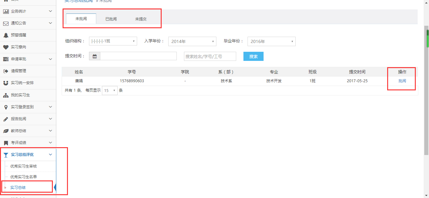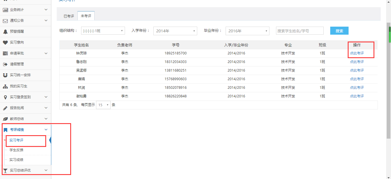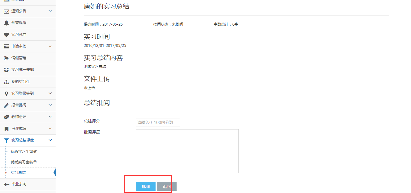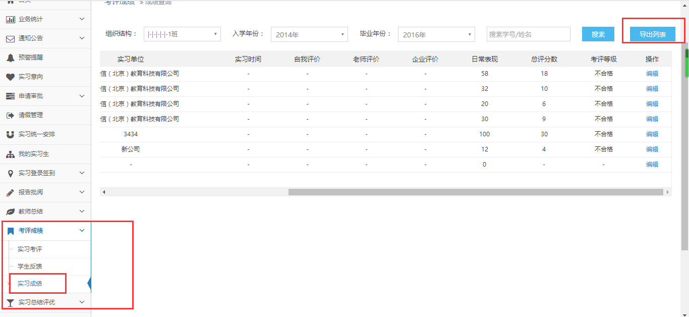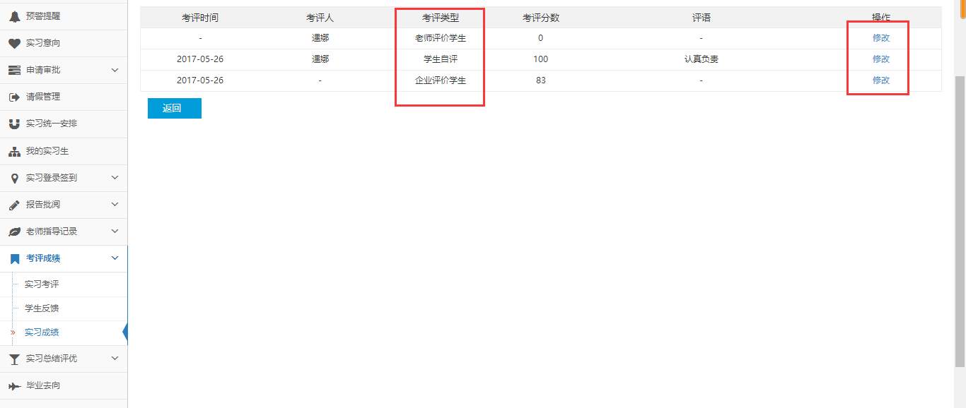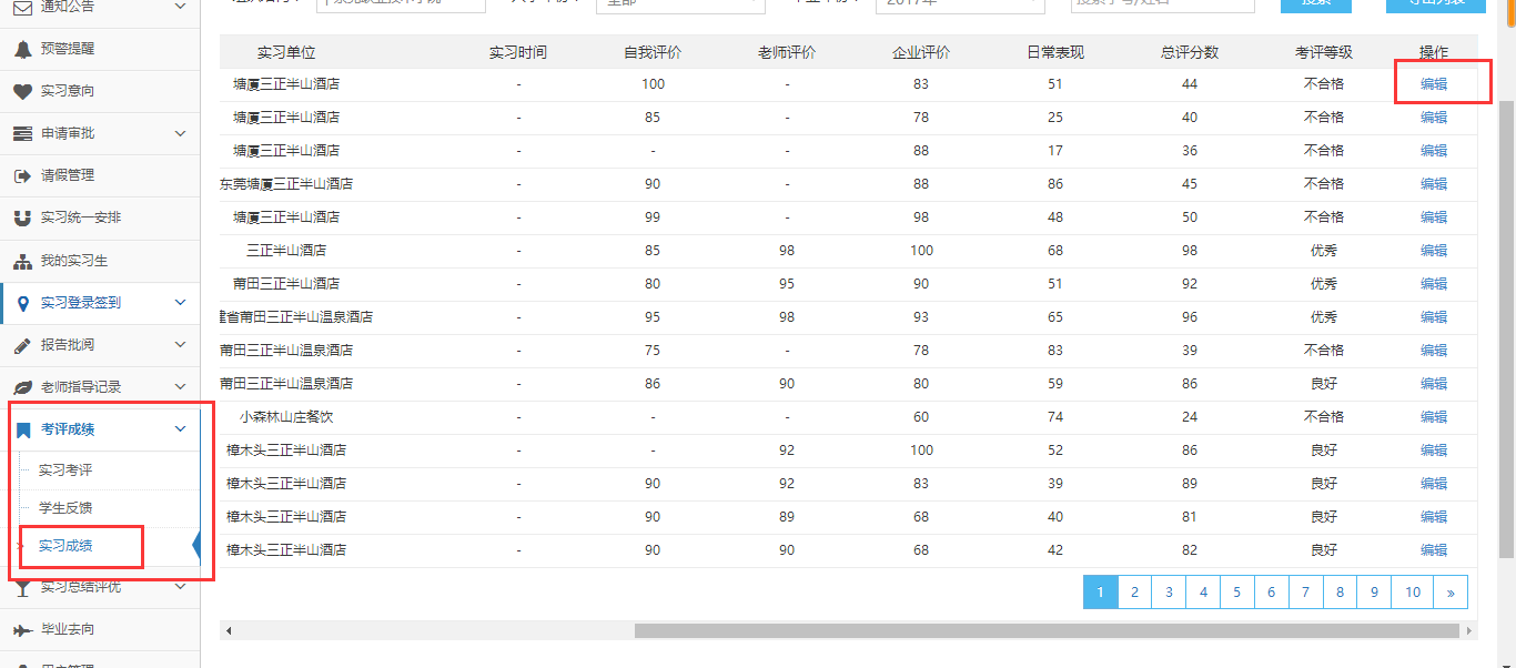 1、审批员工实习总结2、审批员工的结束申请(实习总结跟结束申请,不分先后)。3、员工提交实习结束申请,审批通过后,校内老师进入实习考评,对员工进行考评。4、所有考评完成后,员工的考评成绩可在实习成绩中查看。5、如需修改校内指导老师的评分与评语,可在实习成绩中进行编辑修改。