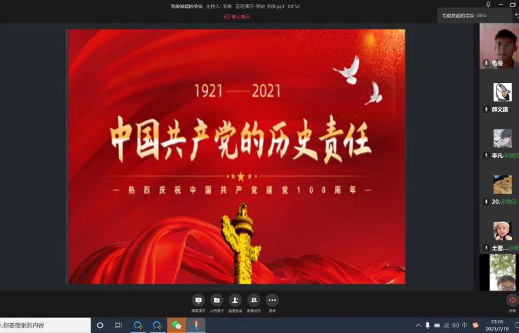 最后,为弘扬百年党史,实践团成员为公司其他员工进行线上党史授课。本次党史分享的主题是“中国共产党的历史责任”,由实践团成员毛俊同学主持。