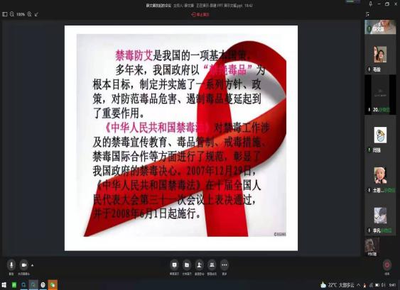 最后,实践团为扩大宣传范围,特开展“禁毒防艾“主题线上宣传活动。本次线上活动的主题是“禁毒防艾”,由实践团成员薛文康担任主持。讲解内容主要包括禁毒的法律法规,以及毒品与艾滋病的关系、禁毒知识等其他相关知识。
