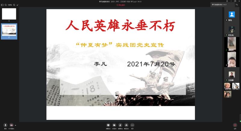 最后,为了弘扬红色文化,传承红色基因,实践团为罗家村青年以及实践团成员开展线上党史授课活动,本次党史分享的主题是:人民英雄永垂不朽,由实践团成员李凡担任主持。