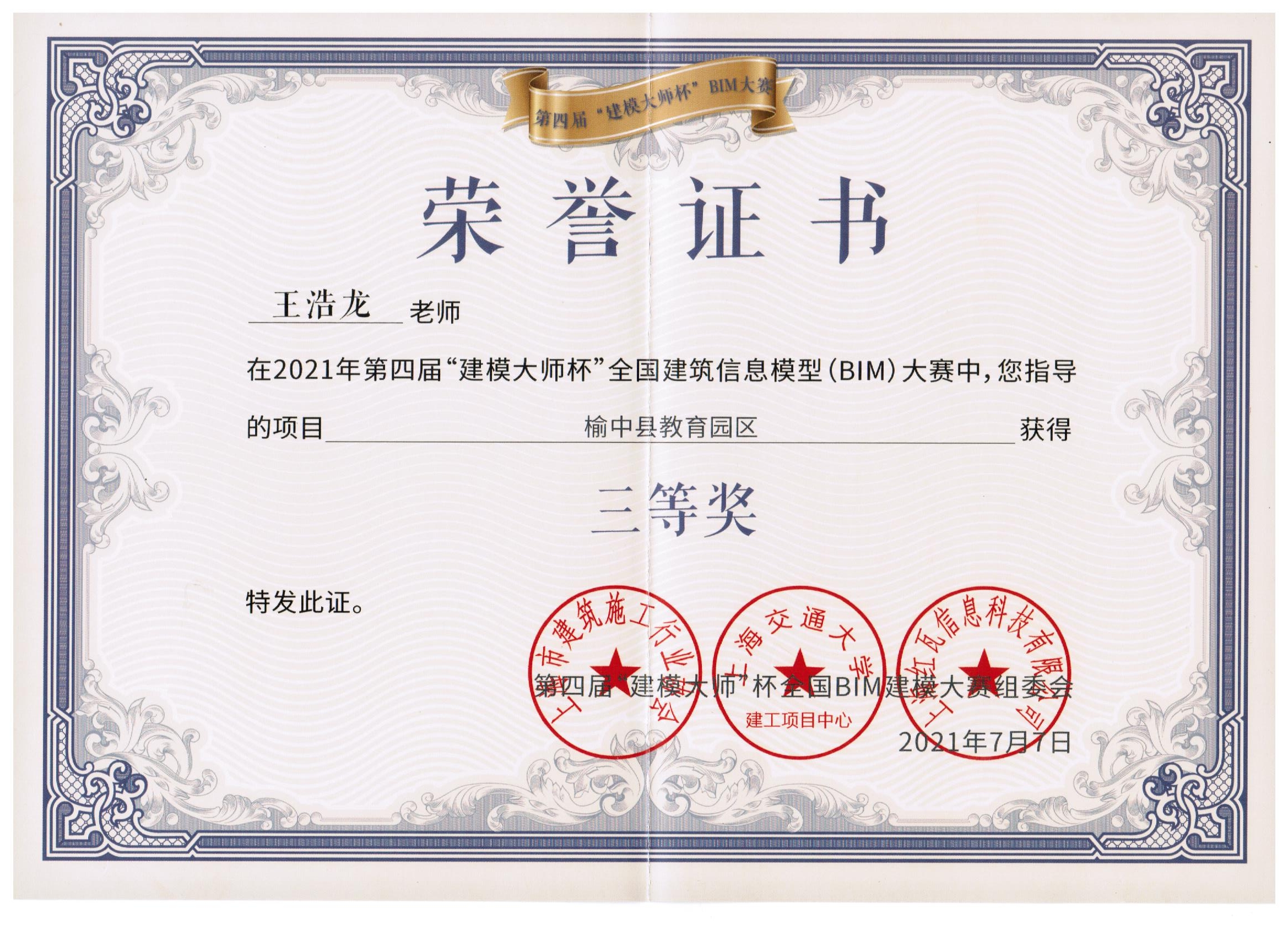 王浩龙老师指导“榆中教育园区”项目获全国BIM建模大赛三等奖