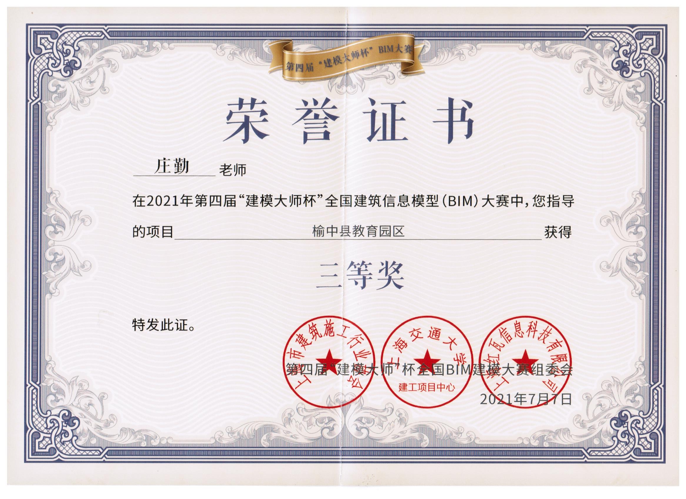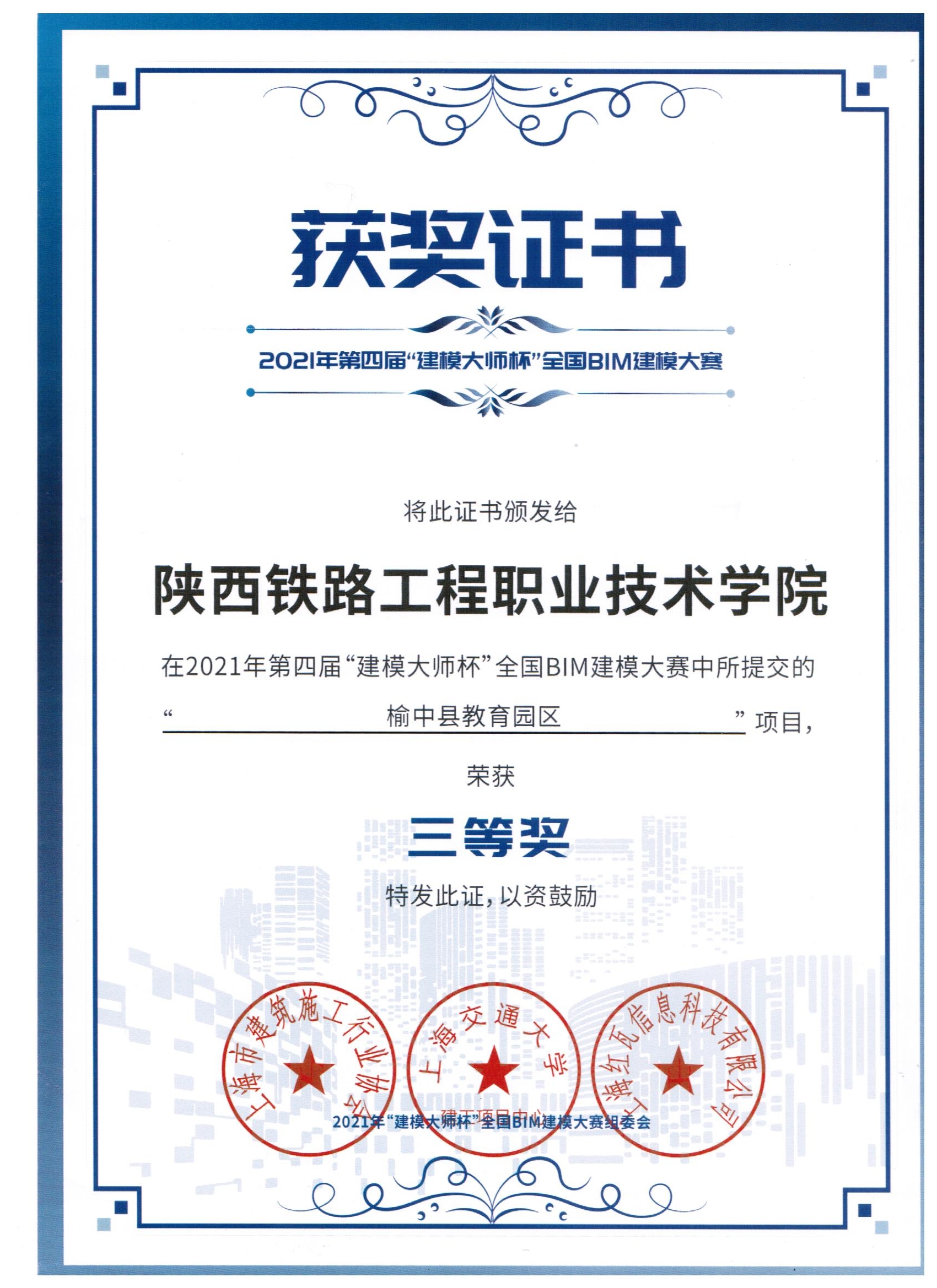 近日,2021年第四届“建模大师杯”全国BIM建模大赛落下帷幕,公司教师王浩龙、庄勤指导公司测量3204班贾浩、检测3204班汪楚政、建信3191班董天萌、杨凌博、建信3192班赵淼5名员工的作品“榆中县教育园区”项目获得三等奖。