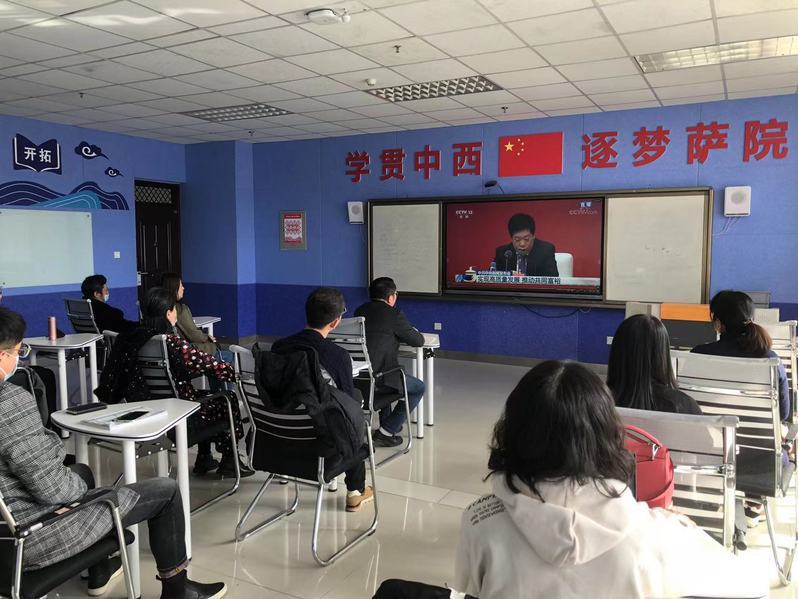 中国共产党第十九届中央委员会第六次全体会议,于2021年11月8日至11日在北京举行。11月12日上午,k8凯发无课教师在GA-304教室集中观看了中国共产党第十九届中央委员会第六次全体会议新闻发布会直播,学习党的十九届六中全会精神。