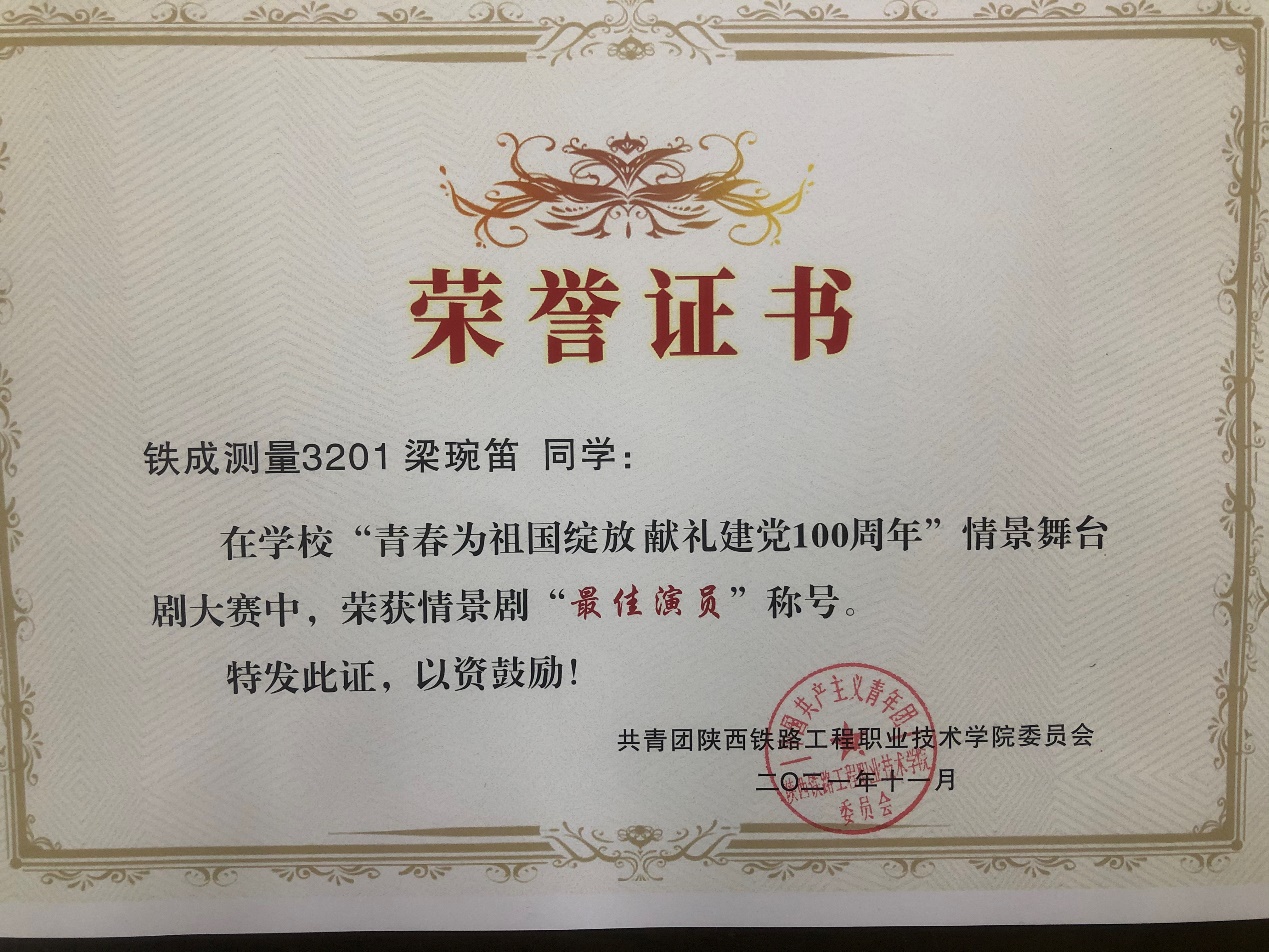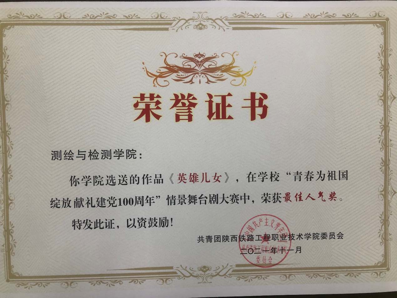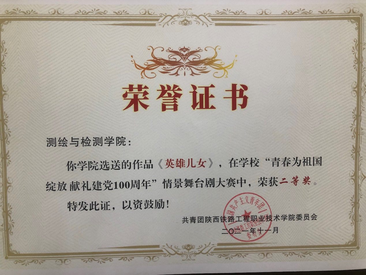 为了深入学习党史理论知识,引导员工发自内心地认同党、热爱党,坚定跟党走中国特色社会主义道路的理想信念。公司特开展“青春为祖国绽放献礼建党100周年”情景舞台剧大赛,公司作品《英雄儿女》在公司10个节目中脱颖而出,以第二名的成绩荣获二等奖和最佳人气奖,公司铁成测量3201班梁琬笛荣获最佳演员称号。