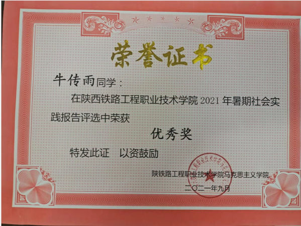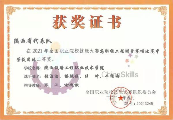 在老师与同学们的帮助及个人的努力下,综合成绩位列班级第二,专业第四,期间获得了“国家励志奖学金”“全国职业技能大赛工程测量赛项高职组团体二等奖”“陕铁院优秀在校生”“公司一等奖学金”“知识竞赛三等奖”“暑期社会实践报告优秀奖”等荣誉。
