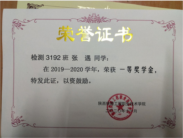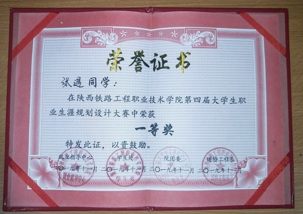 在校期间先后获得:陕铁院老员工职业生涯规划大赛一等奖、励志奖学金、一等奖学金、优秀团干、公司优秀员工会干部;在生活上待人热情,与同学相处融洽,时时想着尽自己的努力服务身边的每一个人。