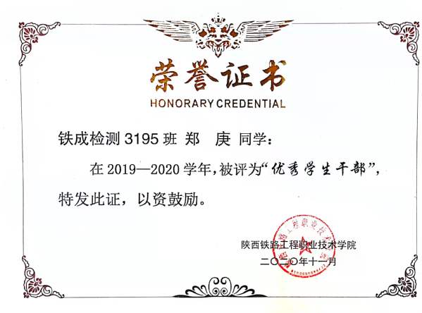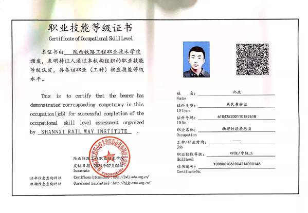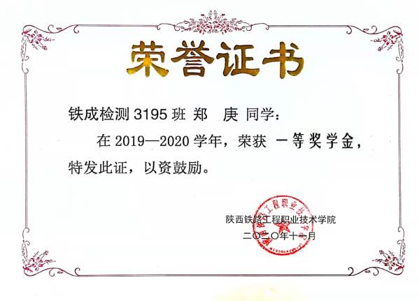 在不断努力下,取得优异的成绩,综合成绩位列班级第三,专业第三。期间获得“国家励志奖学金”“公司一等奖学金”“军训先进个人”“优秀员工干部”“优秀团员”“学雷锋先进个人”“优秀易班员工干部”“跟岗实习优秀学员”“弘扬工匠精神主题征文比赛三等奖”陕铁院校员工会工作中荣获“优秀干事”等优异成绩;并且在校期间参加各项技能证书的考核测试,获得“物理性能检验员(中级)”“高等公司英语应用能力(B级)”技能证书。
