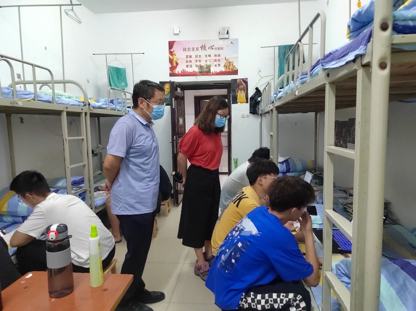 公司领导、辅导员和驻校教师不定期走进员工宿舍进行走访,深入了解员工返校后的思想动态,同时做好校园疫情防控宣传和宿舍安全卫生检查,督促同学们做好卫生通风和宿舍安全防范,鼓励同学们调整好心态和生活作息。