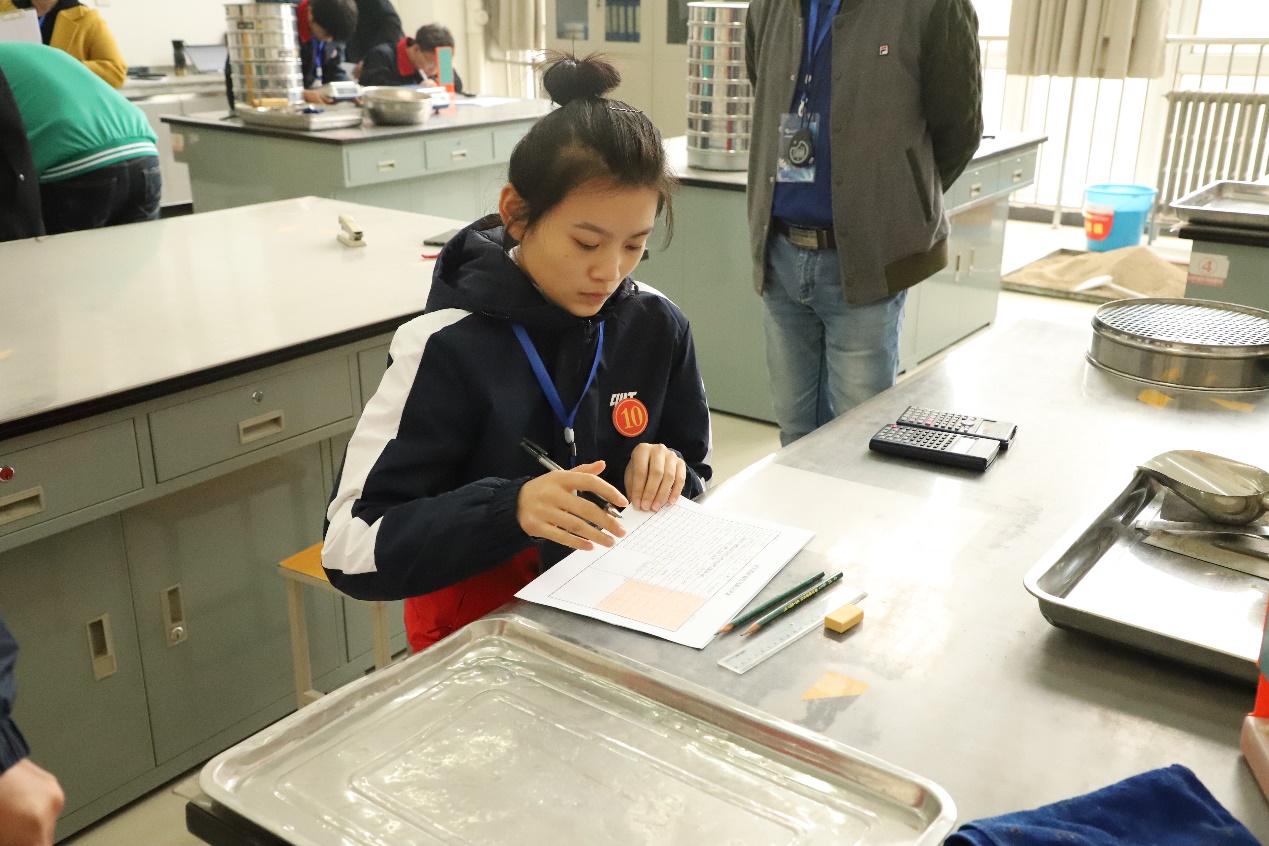 参赛队在45分钟内完成细集料的筛分试验、计算细度模数、评定颗粒级配和粗细程度。