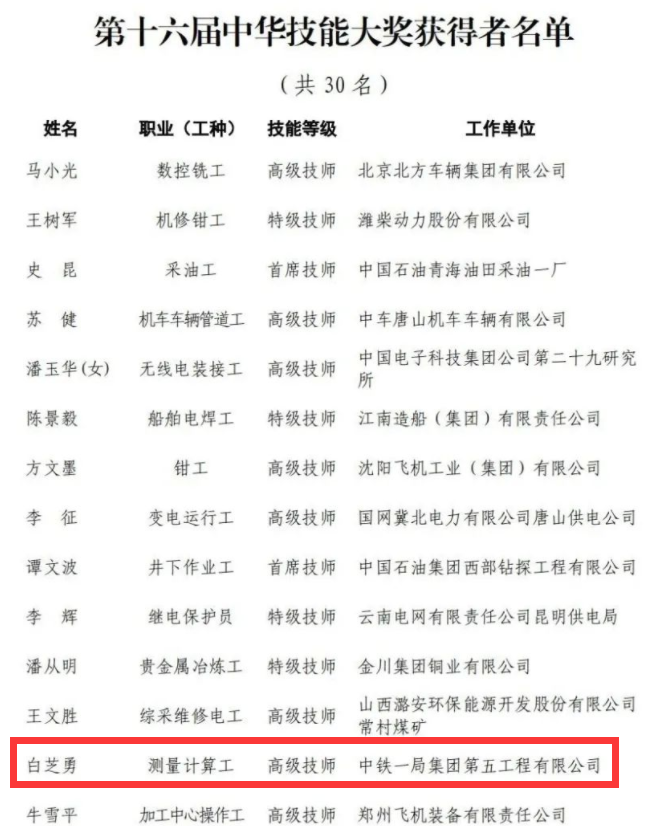 12月26日下午,人力资源社会保障部发布了《关于表彰第十六届中华技能大奖和全国技术能手的决定》(人社部发[2022]87号),白芝勇技能大师工作室主持人白芝勇作为“测量计算工”职业(工种)高级技师,被授予第十六届“中华技能大奖”称号。