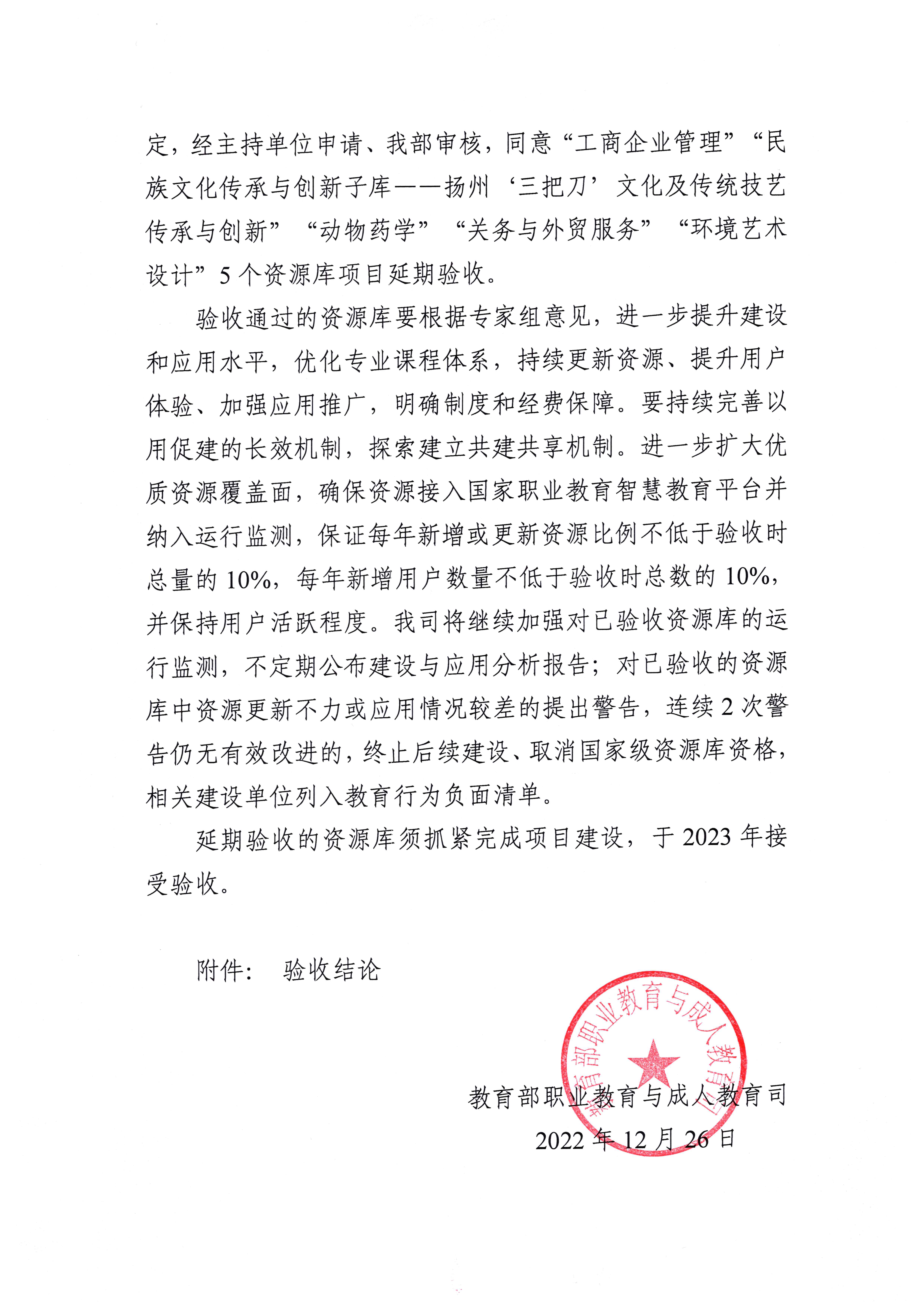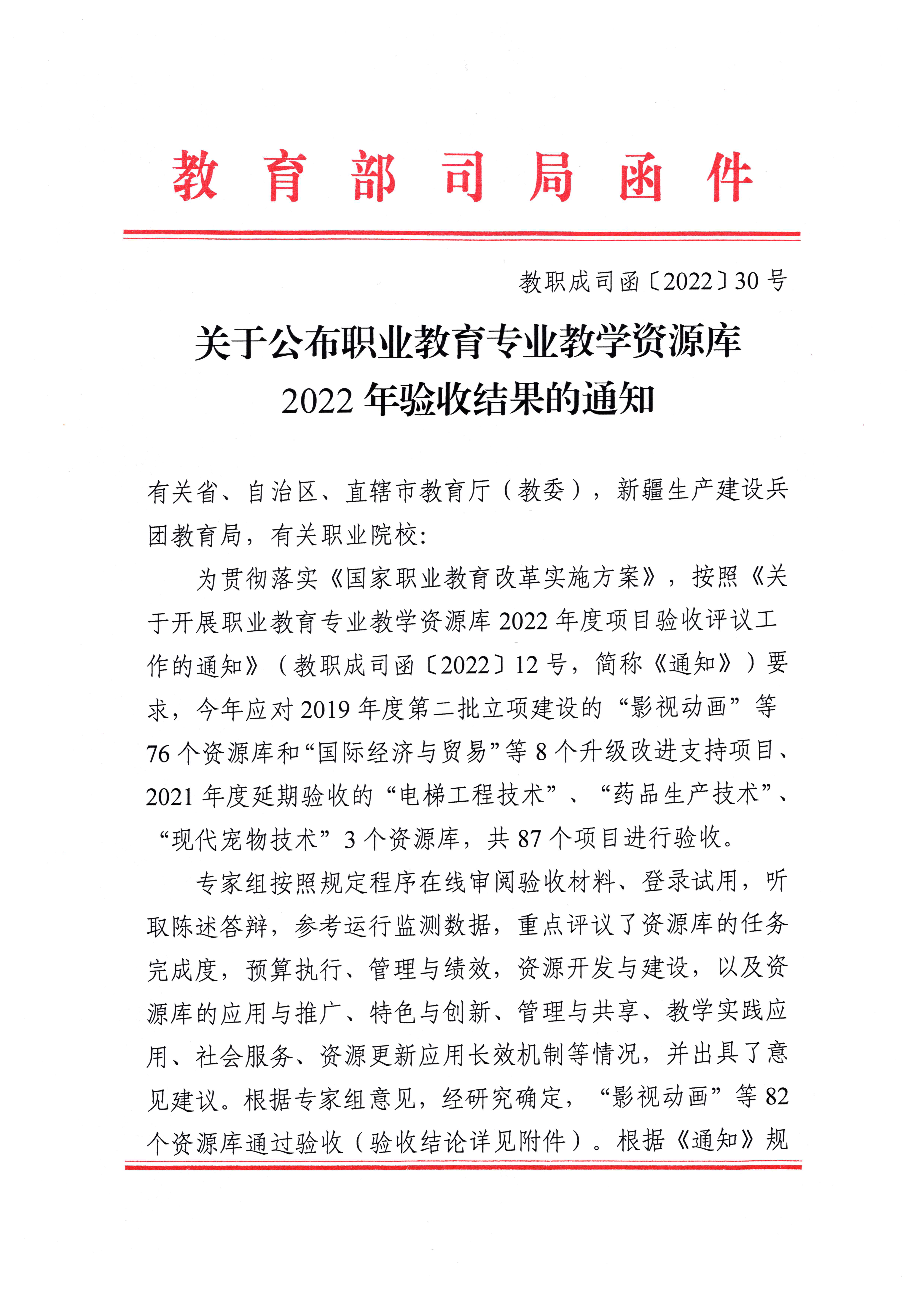 2022年12月29日,教育部职业教育与成人教育司印发《关于公布职业教育专业教学资源库2022年验收结果的通知》(教职成司函〔2022〕30号),由公司牵头主持的土木工程检测技术专业教学资源库项目顺利通过验收。