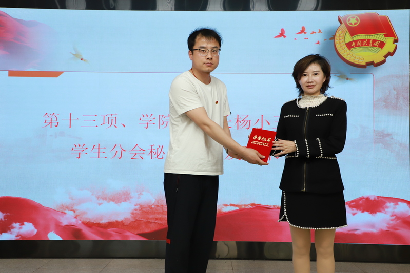 公司副经理杨小玉为员工分会秘书长王育聪颁发聘书