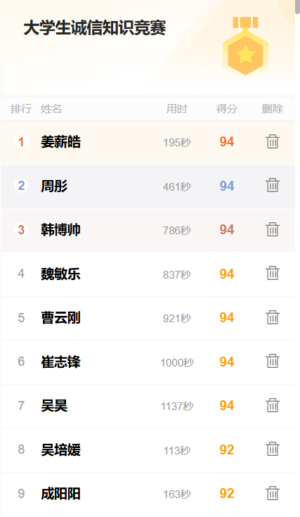 2024年5月26日晚自习公司各班通过问卷星平台开展了“诚信教育知识竞赛”。通过此次竞赛,同学们更加深入地了解了诚信的重要意义和价值,增强了诚信意识。竞赛紧张而激烈,大家在比拼中巩固了诚信知识。还营造了良好的诚信氛围。我们将继续开展类似活动,进一步推动诚信教育深入发展,培养更多诚实守信的优秀人才。(云海盈)