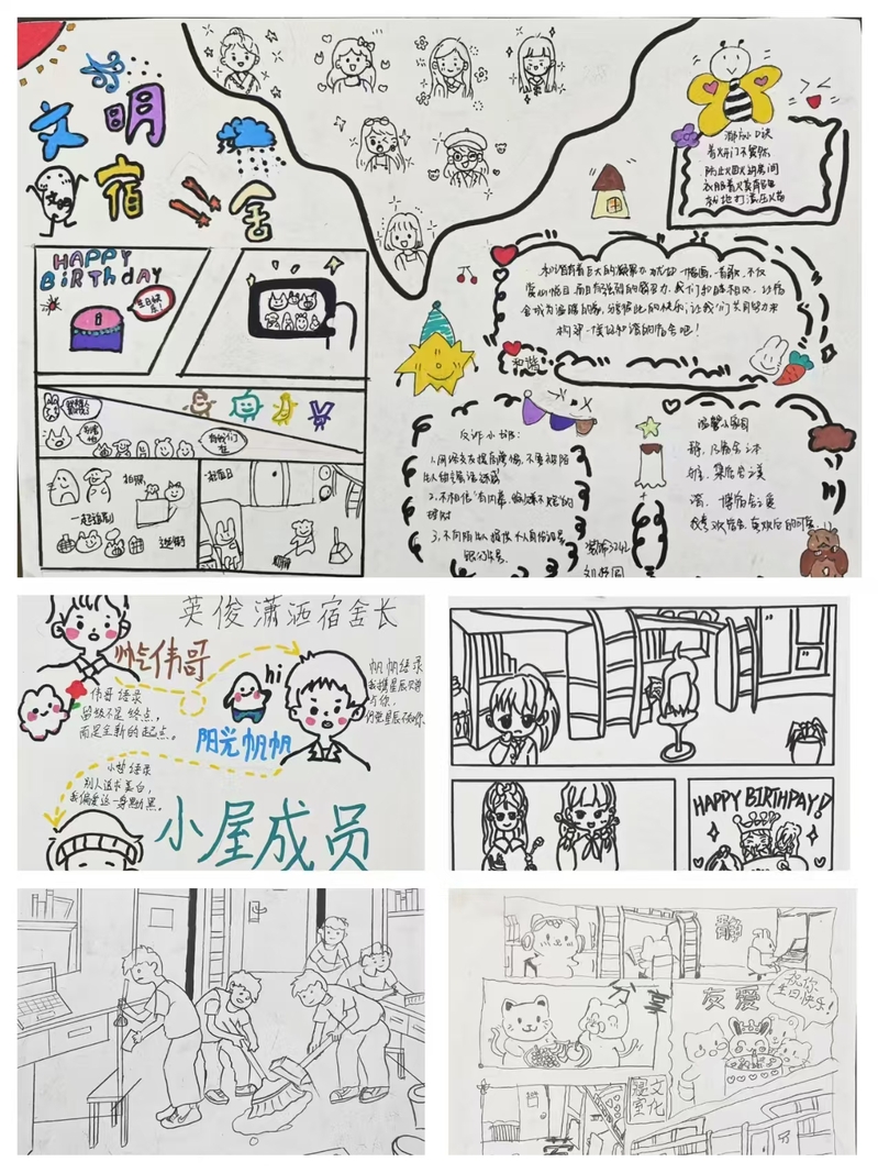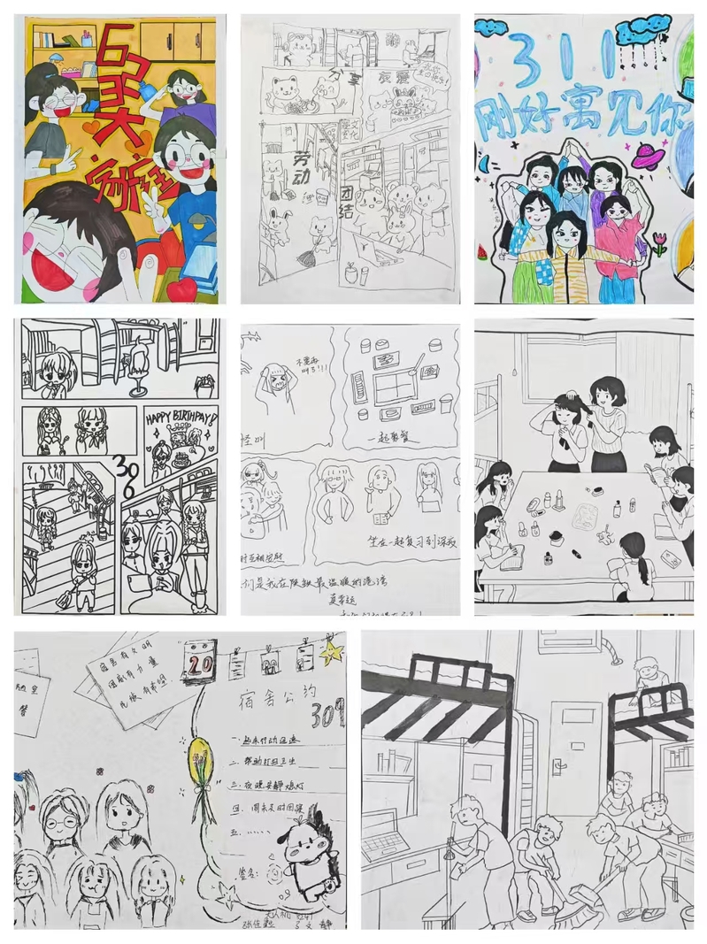 同学们积极响应,结合自己进入老员工以来和宿舍同学之间相处的点点滴滴,如大家一起营造温馨的家、给同学们过生日、一起怪叫、遇到难过的事情互相安慰,坐在一起复习到深夜。参赛选手用心构思。一幅幅生动的手绘作品以幽默、温馨的笔触,描绘同学们日常相处的温馨瞬间。记录宿舍生活中的欢笑和感动,展示了当代老员工对宿舍人际关系的独特理解。